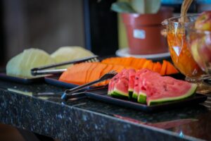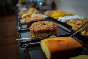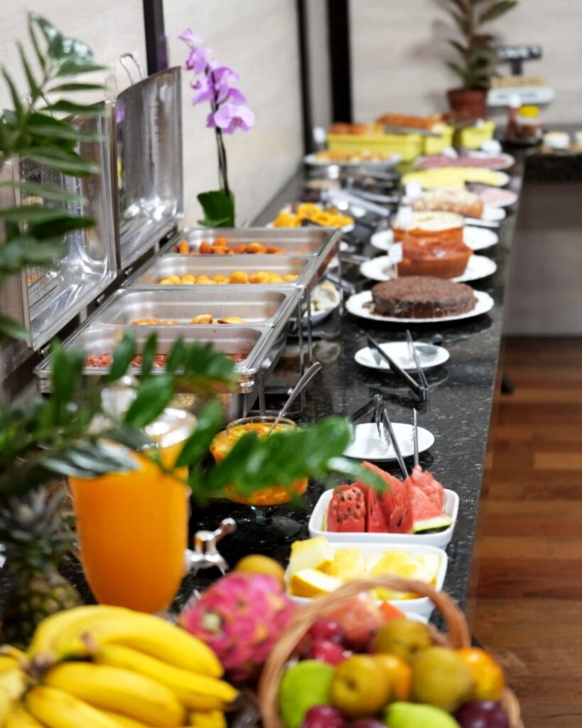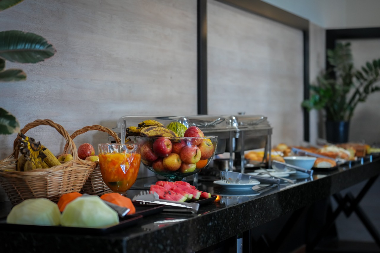 O café da manhã do Hotel Pedra Moura é um convite especial: sabor, frescor e energia para começar bem o dia. Servido com pães, bolos, frutas e bebidas variadas, é o toque perfeito para uma experiência completa de conforto e hospitalidade.
